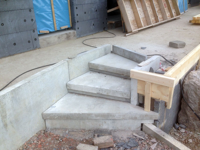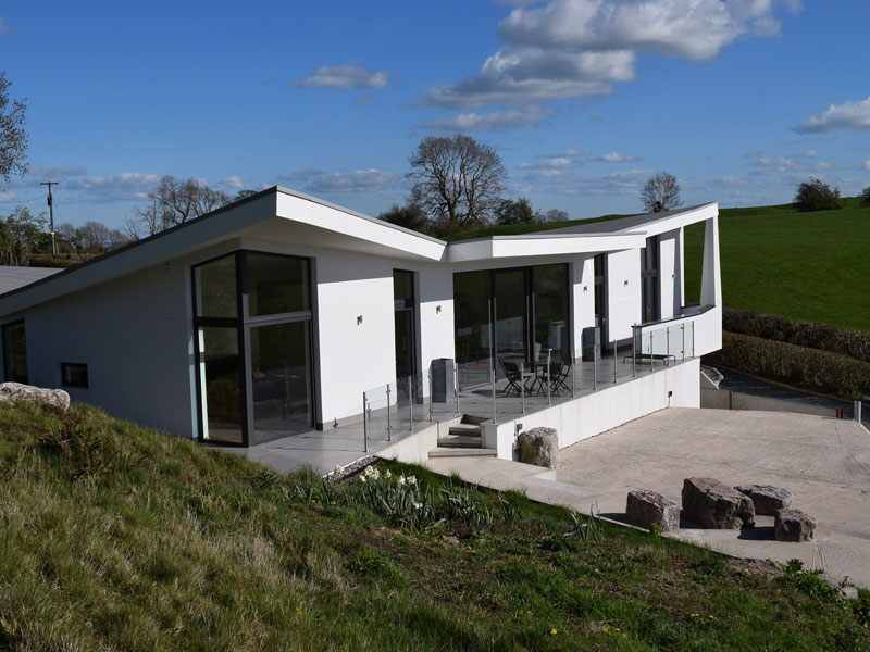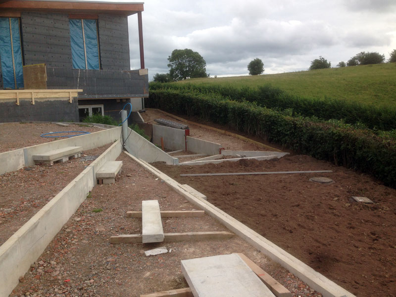 Fairview is a grand design property nestled on a hillside. We were commissioned to demolish the existing bungalow, clear the site, excavate for foundations for the new build, and landscape with concrete panels to create triangular terraced areas. We installed water, a water harvesting tank, electric and data, and a new septic tank with drop chamber manholes, to the new property.