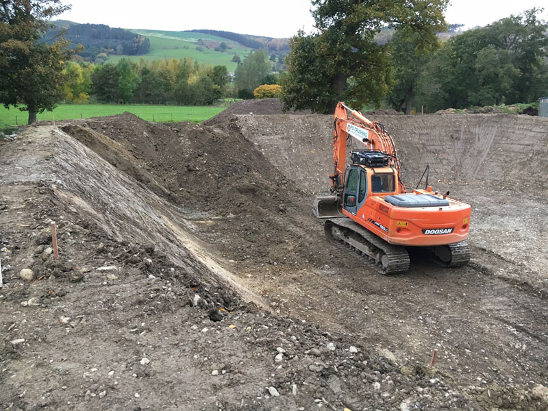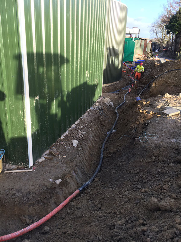 We excavated and installed utilities (gas, water, electric and data ductings and pipes). We installed the groundsource heat loop and fusion welded the pipework. We excavated and formed a slurry lagoon with earth bunding and batters. We erected a steel portal framed building and installed associated concrete works, i.e. concrete pads, floors, concrete ring chambers for sumps.